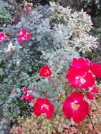 Een jonge struik van een helder karmozijnrode roos die continu bloeit van de zomer tot laat in de herfst. Een zeer succesvolle var