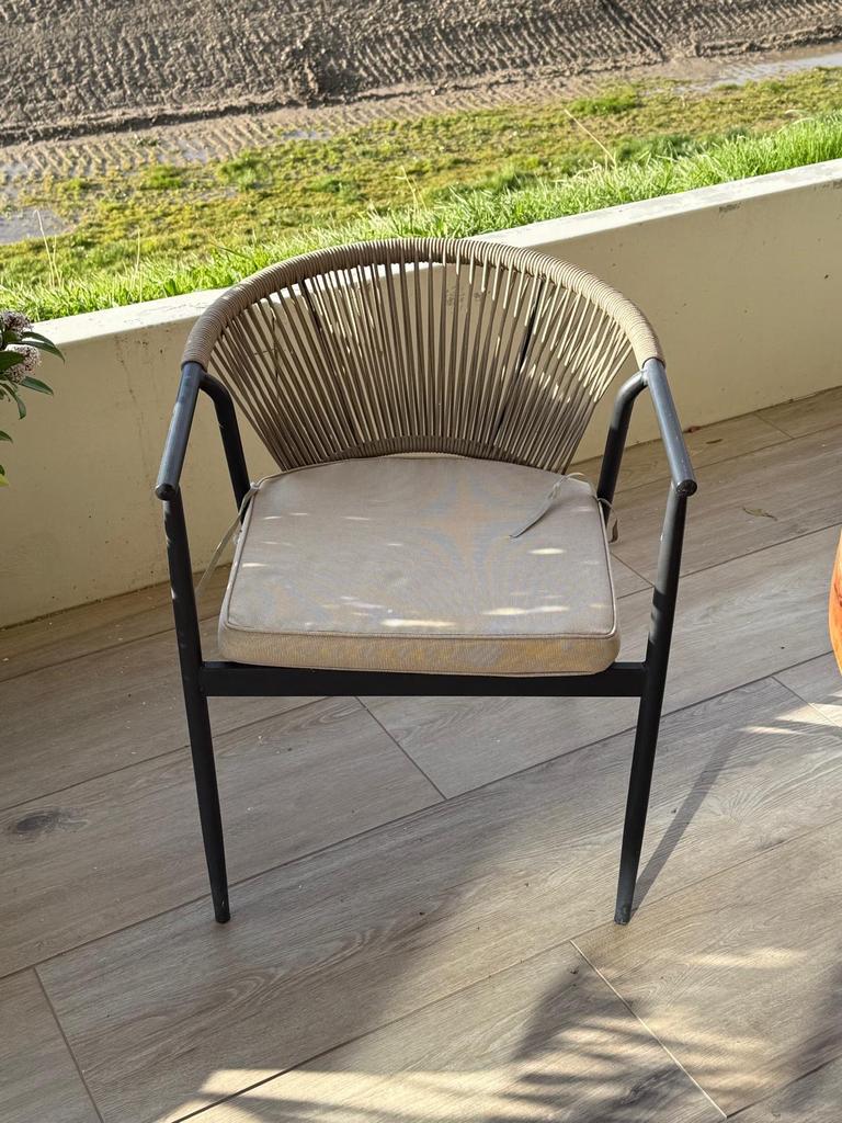 Aangeboden: een set van twee stijlvolle tuinstoelen, perfect voor op het balkon, terras of in de tuin. De stoelen hebben een stevig metalen frame en een zitting en rugleuning van gevlochten materiaal