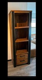 Mooie mango houten kast met metalen details. De kast heeft twee lades onderin en meerdere planken. Ideaal voor het opbergen van sp