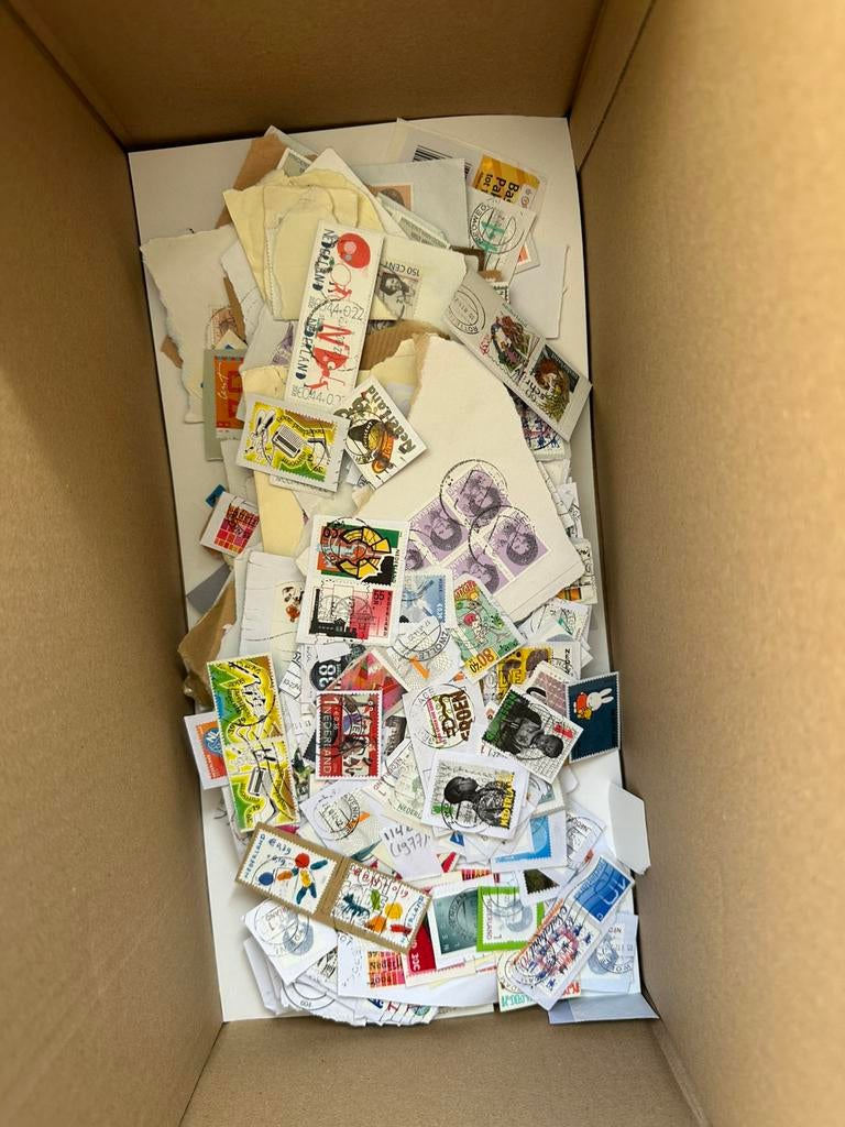 Doos met een totaal gewicht van ongeveer 5100 gram vol met nederlandse postzegels op papier.