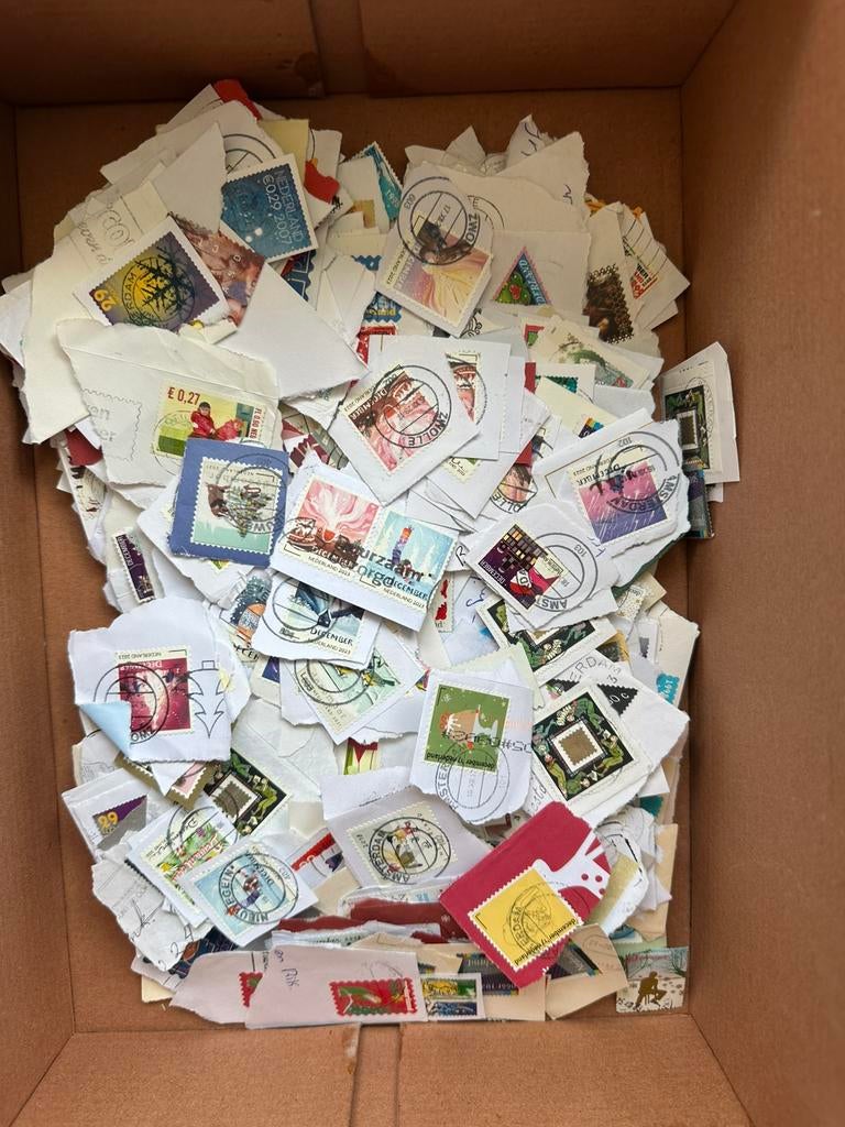 Doos met een totaal gewicht van ongeveer 2 kilo vol met kerstzegels nederland, zowel op als vanaf papier.
