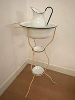 Prachtige emaille lampetset! Leuk voor bijv een bed&breakfast, plantenhoek, serre , logeerkamer. .. De set bestaat uit een kan en een schaal, geplaatst op een elegant rekje met twee extra plateaus