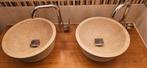 Wegens verandering badkamer. Deze set bestaat uit twee prachtige natuurstenen waskommen, compleet met bijpassende chromen kranen. De waskommen hebben een unieke textuur aan de buitenkant en een gladde