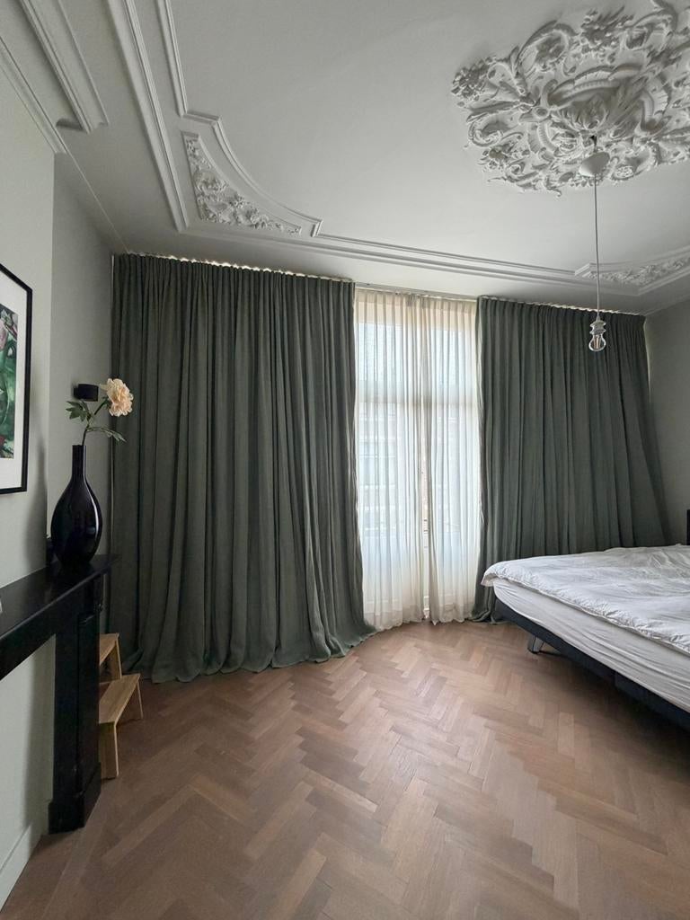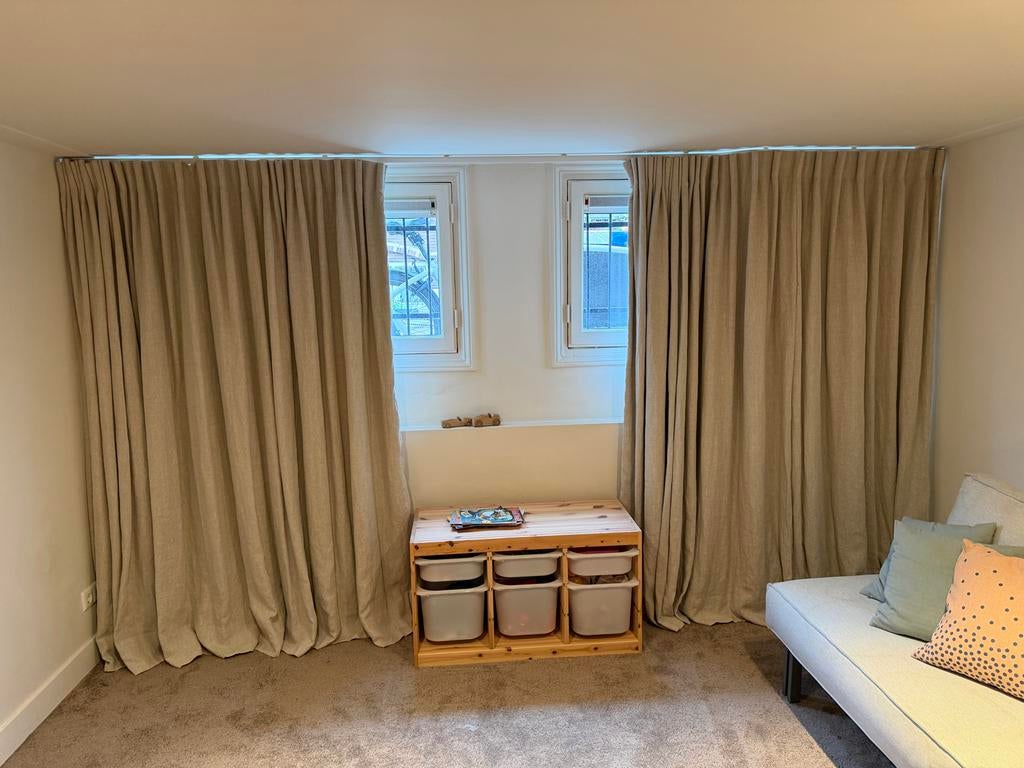 Prachtige warm grijze linnen gordijnen van zware kwaliteit, perfect voor een sfeervolle en luxe uitstraling in elke kamer. Met een hoogte van 310 cm en een breedte van 350 cm zijn ze ideaal voor hoge