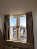 Vier paar lichtgrijze linnen gordijnen, gevoerd en verduisterend, zware kwaliteit. Verschillende afmetingen. Ideaal voor kleinere ramen of dakkapellen. De gordijnen zijn gebruikt, en hebben wat vlekke
