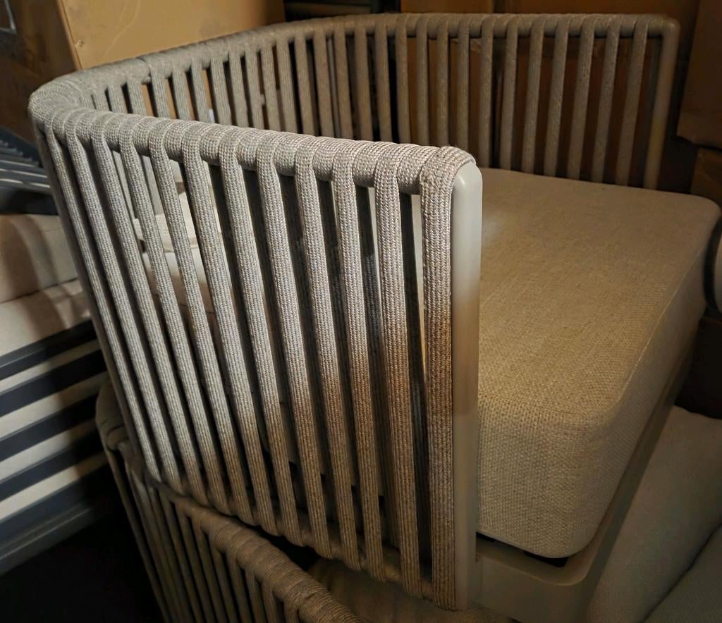 Een showroommodel garden impressions hoek loungeset diningset 289,5x226cm acacia white wash hout rope touw taupe kussens grey sand de kussens zijn voorzien van een waterafstotende coating en zijn uitr