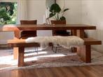 Prachtige grote teak houten tafel met bijpassende eetbank / bankje. Stevig en sfeervol, perfecte set voor in de eetkamer of woonke