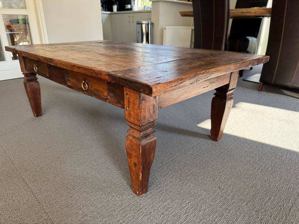 Deze salontafel is gemaakt van hardhout en heeft twee ruime lades. De afmetingen zijn 140 cm lang, 81 cm breed en 49 cm hoog. De tafel is van een mooie en degelijk handgemaakte kwaliteit.