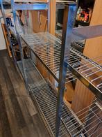Complete rvs stelling van hupfer, ideaal voor koeling of vriescel. De stelling heeft een totale lengte van 3 meter en bestaat uit 2 keer 1 meter met ieder 3 legborden, en daartussen kan nog een meter