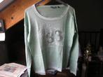 Dunne, mintgroene top, mt s, van vögele. Met witte rand om hals en (lange) mouwen. Op het voorpand een tekst in het frans: er staat o.a.: Je t'aime - merci - a bientot - paris - mon ami. En het ge