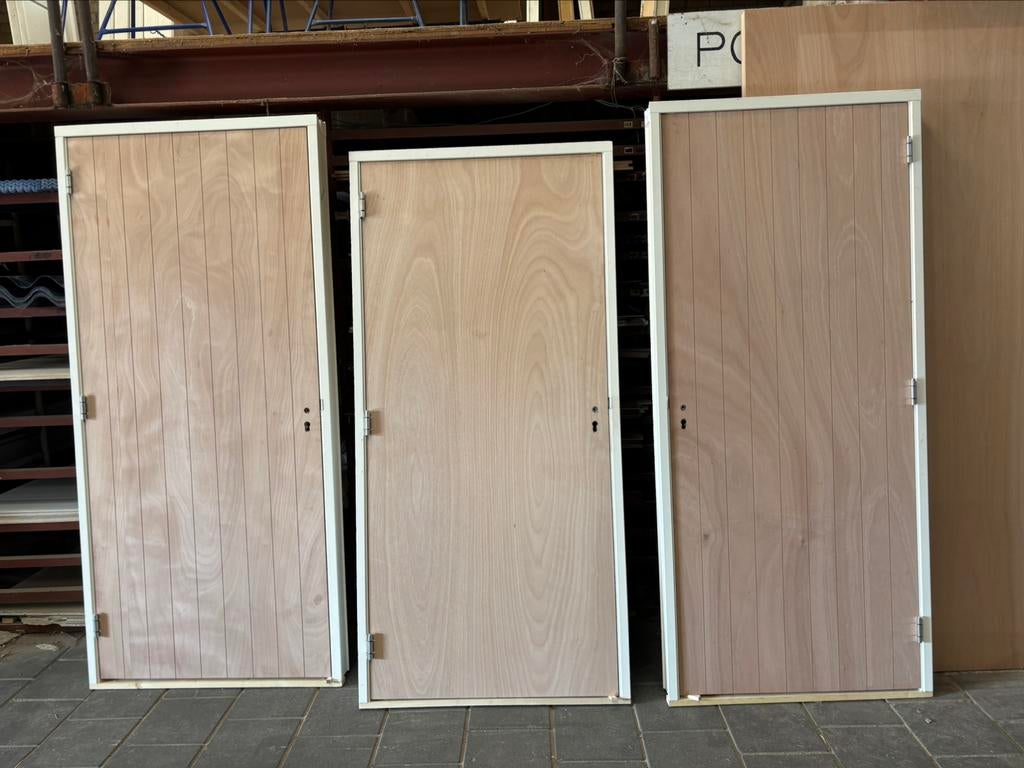 Aluplex of alutherm , okoume deurplaat compleet afgehangen in hardhouten kozijn met veiligheidscharnieren en slot , diverse afmetingen op voorraad, ook in dubbele deuren uitvoering. Extra opties ! Fre