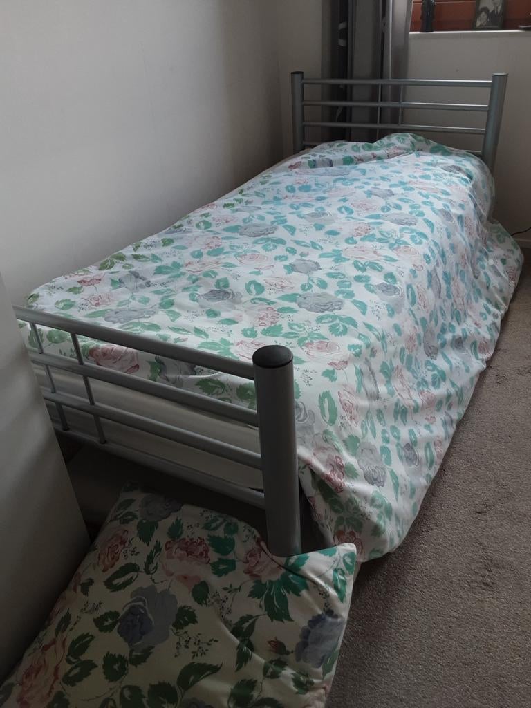 Eenpersoons bed met latte bodem en dekbed metalen frame afmeting 200×90 cm. Gebruikt