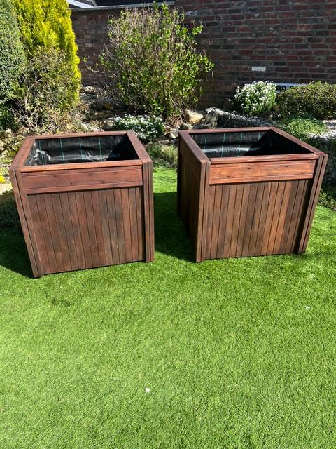 Verrijdbare hardhouten bankirai bloembakken, geschikt voor palmbomen, olijfbomen etc. Afmetingen zijn 70x70x80 (lxbxh) bakdiepte is 70 cm, bakken zijn blind geschroefd en bekleed met worteldoek. BakkeZo goed als nieuw Ophalen