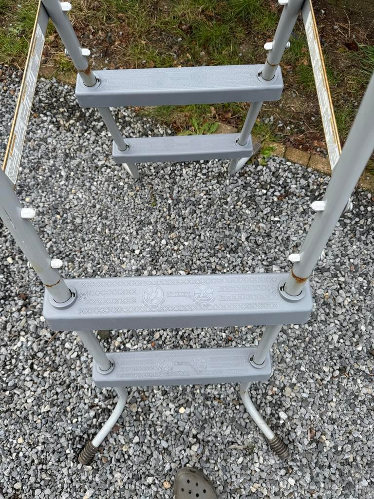 Dit bestway zwembadtrapje is ideaal voor bovengrondse zwembaden. Het trapje is gebruikt en vertoont lichte roestplekken, zoals te zien op de foto's, maar is nog volledig functioneel en stevig. Per