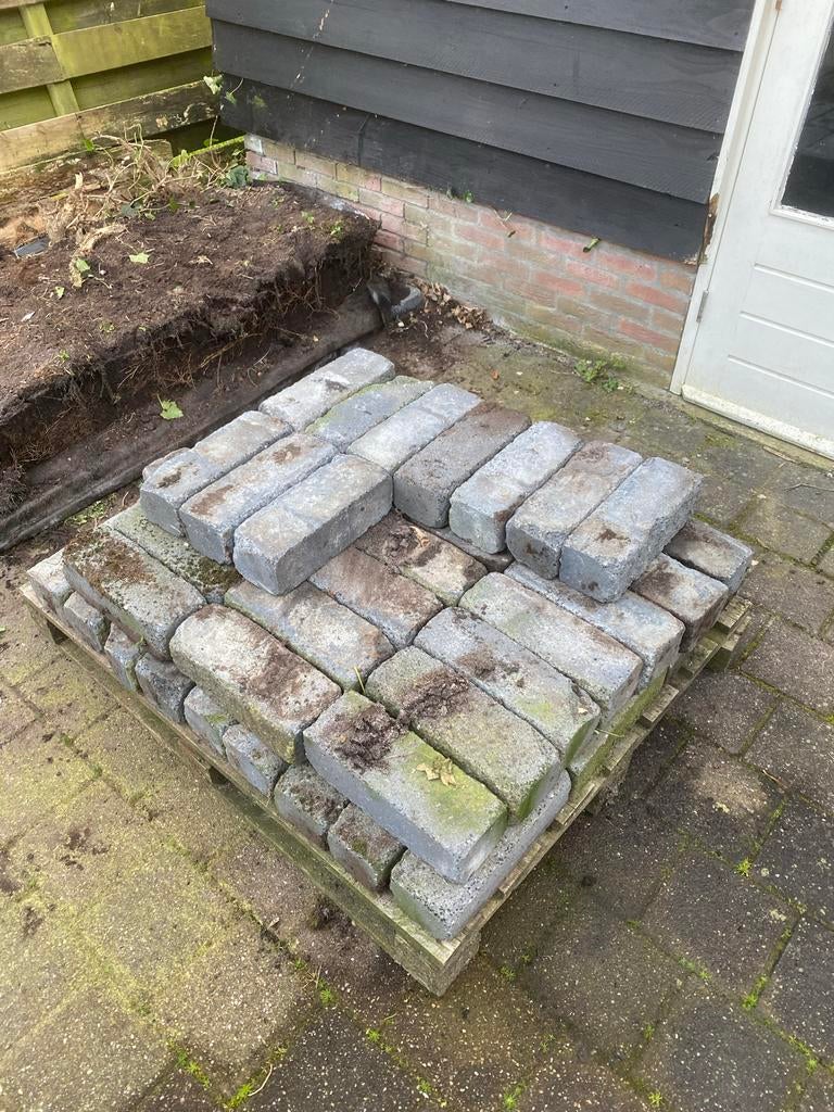 Gratis op te halen! Een stapel grijze klinkers. Ze liggen op een pallet. Er zit wat vuil en mos op, maar ze zijn nog goed te gebruiken voor bijvoorbeeld een pad of borde