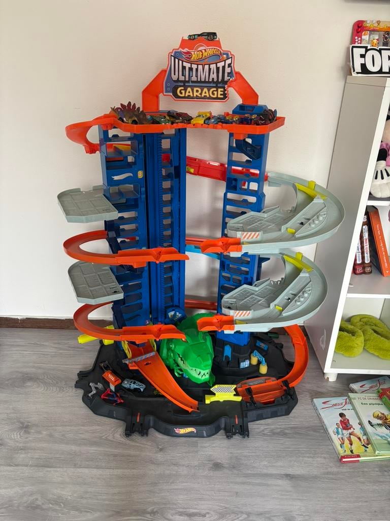 Hotweels garage dino. De dino kop kan omhoog en wanneer de auto’s racen gaat die omlaag. Zo goed als nieuw