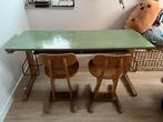 Leuk vintage schoolbureautje met twee bijpassende stoeltjes. Het setje is in gebruikte staat, met de gebruikelijke gebruikssporen
