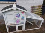 Konijnenhok met vaste ren grotendeels goed in de verf, alleen de randen hebben een laagje verf nodig. Zie foto's. Folie op ren kan eraf eventueel zijn tegels voor ondergrond bij te leveren