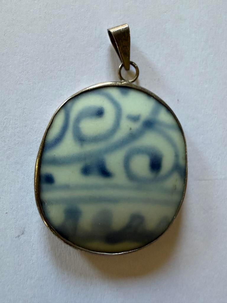 Prachtige vintage hanger, vervaardigd uit 925 sterling zilver, met een uniek ingelegd stuk blauw-wit keramiek. Het keramiek heeft een sierlijk, organisch patroon in blauwtinten op een lichte achtergro