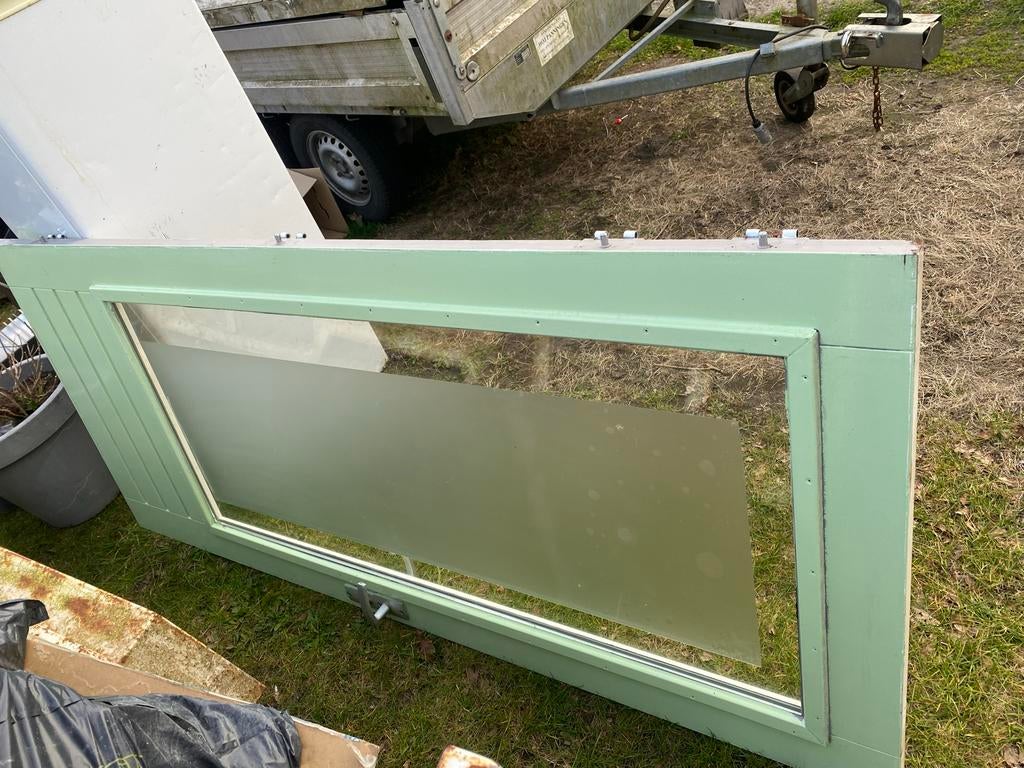 Mooie hardhouten deur met glas, ideaal voor binnen- of buitengebruik. De deur is stevig en van goede kwaliteit. De kleur is lichtgroen aan de ene kant en wit aan de andere kant. De deur is gebruikt, m