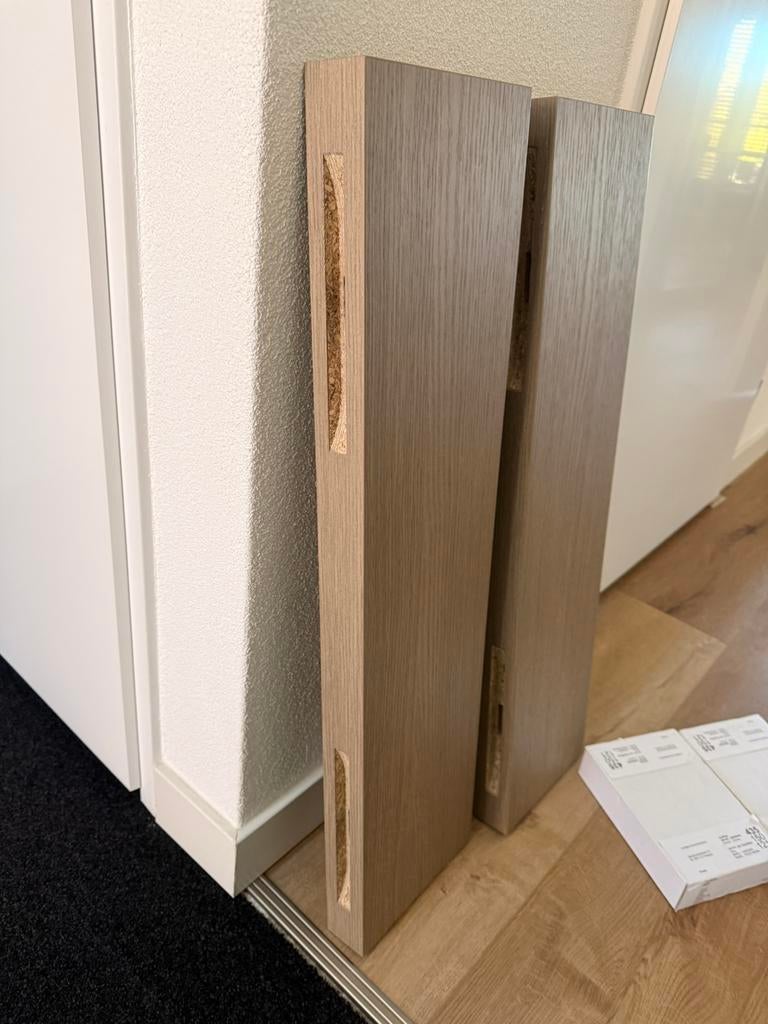 2 eiken planken 80x20x5cm met zwarte steunen / nieuw zit nog nieuw in de verpakking gekocht bij lentjes droom keukens helaas toch te klein zware kwaliteit! Gekocht voor 250€ alleen per set te kop