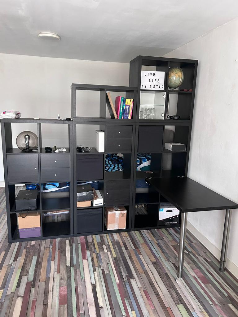 Onderdelen kallax kast (2x4 vakken) eventueel incl lades, kastjes en bureau (ook op te hogen tot bar hoogte) €45,- per 2x4 kast 77cm bij 147cm per kastdeel gebruikt maar in nette staat! Op te halZo goed als nieuw Ophalen