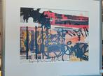 Een levendige en dynamische zeefdruk van george weidweiller uit 2014, genummerd 1/180. Dit werk toont een complexe collage van verschillende texturen, kleuren en grafische elementen, waaronder graffit
