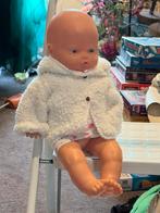 Schattige babypop met een zachte witte jas en een luierbroekje met aardbeienprint. De pop is in goede staat.