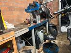 Robuuste stalen werkbank, ideaal voor de werkplaats. Afmetingen: ongeveer 220cm lang en 61cm breed. Voorzien van twee zware bankschroeven. Perfect voor diverse klussen en projecten.