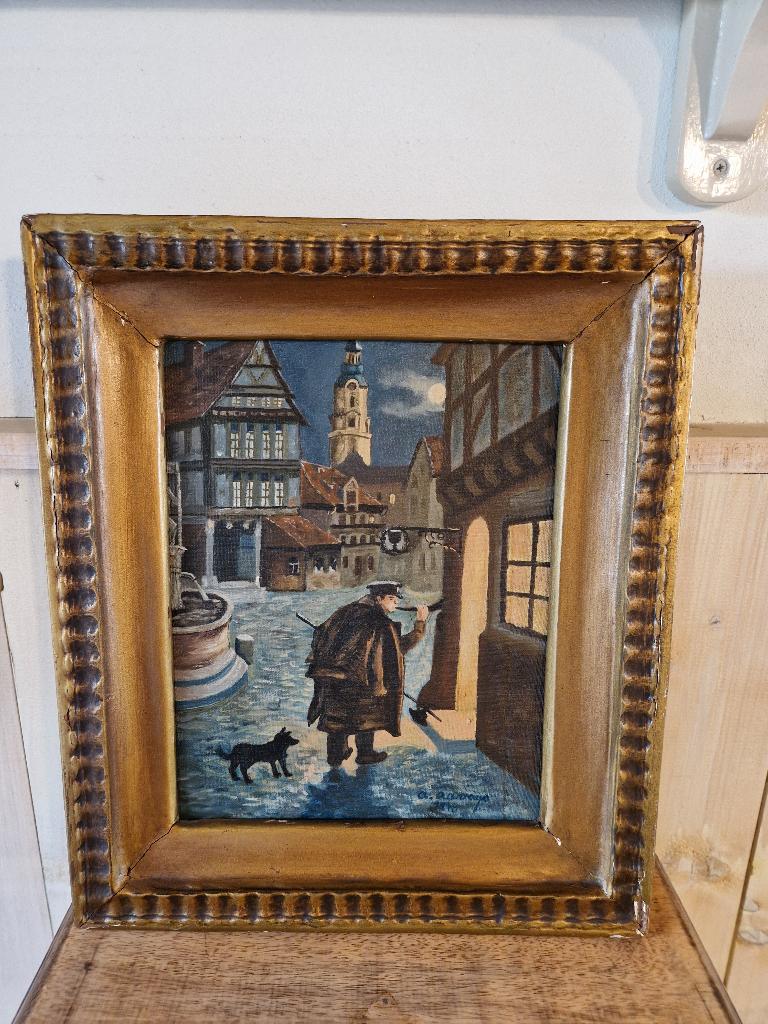 Mooi oud schilderij op canvas in originele papier mache lijst over houten geraamte. De nachtwaker gesigneerd a. Ravays 1948 37 x 44 cm graag serieus bieden