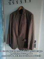Buitenkansje voor de iets grotere maat; te koop, prachtig donkerbeige 100 % polyester, mooi gevoerd 2-delig pak. Maat 64, merk travelmaster 2 rijen knopen, mouw met 4 knoopjes. Broek met elastieken baZo goed als nieuw Ophalen of Verzenden