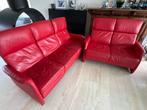 Mooie rode leren bankstel bestaande uit een 2-zits en een 3-zits bank. De banken zijn gebruikt, maar nog in goede staat. De banken