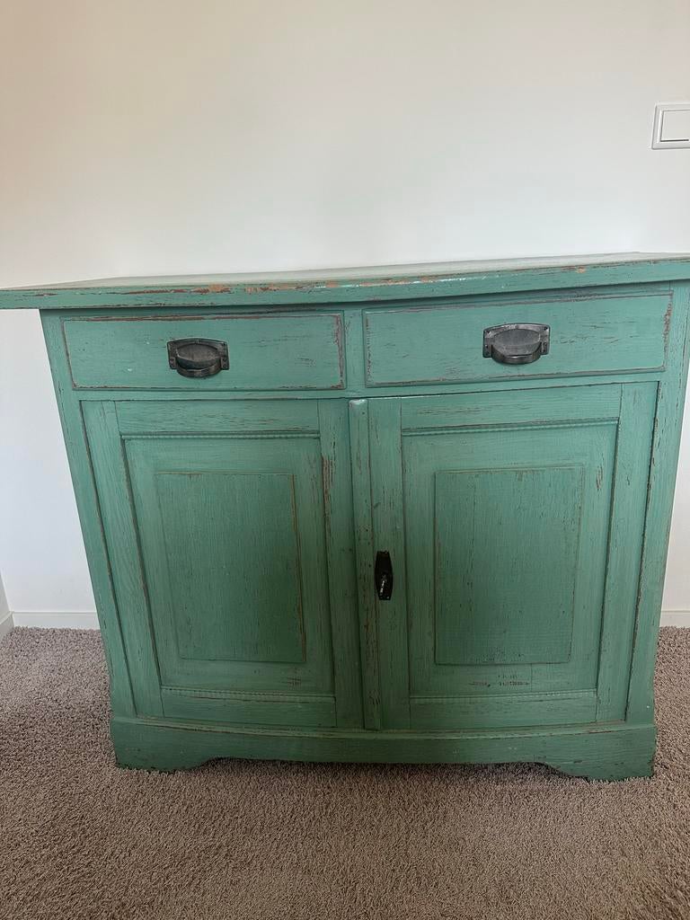 100x92x48 (breedte, hoogte, diepte) prachtig vintage kastje in een unieke groene kleur. Dit houten dressoir heeft twee handige lades bovenaan en twee deuren die toegang geven tot een opbergruimte met