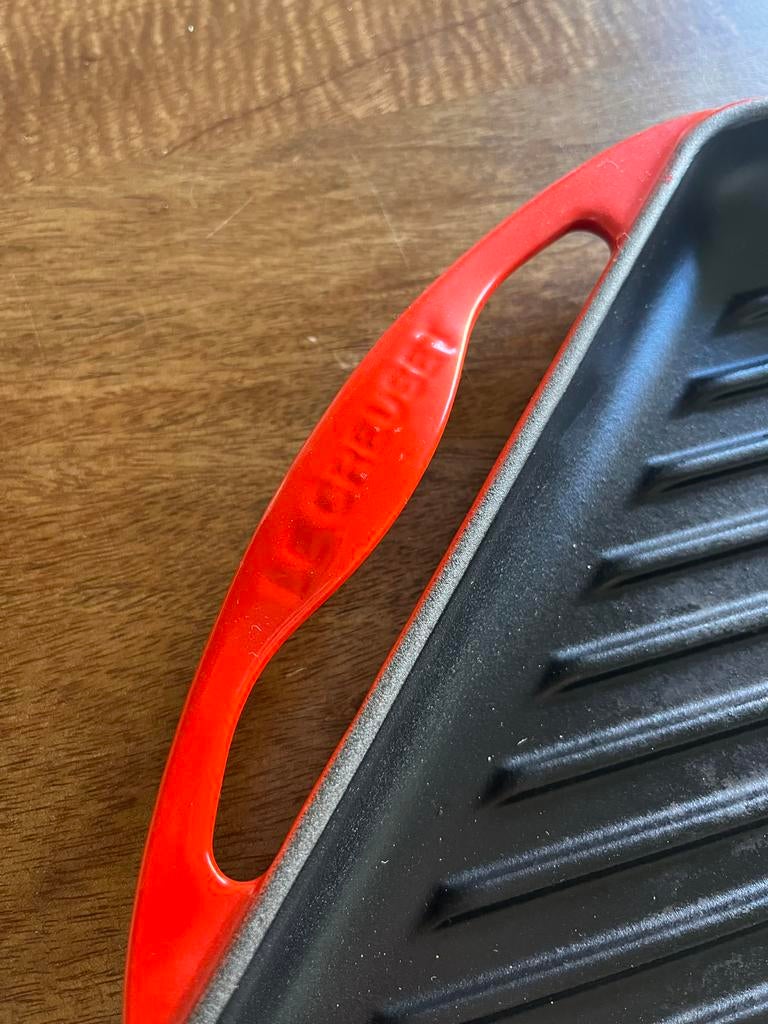 Te koop: een prachtige le creuset grillplaat in kersenrood, perfect voor het grillen van vlees, vis en groenten. De plaat is rechthoekig en heeft afmetingen van 32 x 22 cm. Gemaakt van duurzaam gietij
