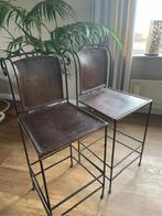 Twee stijlvolle barkrukken met een leren zitting en rugleuning, gecombineerd met een stevig metalen frame. De krukken zijn in gebruikte staat, maar nog steeds in goede conditie. Perfect voor aan de ba