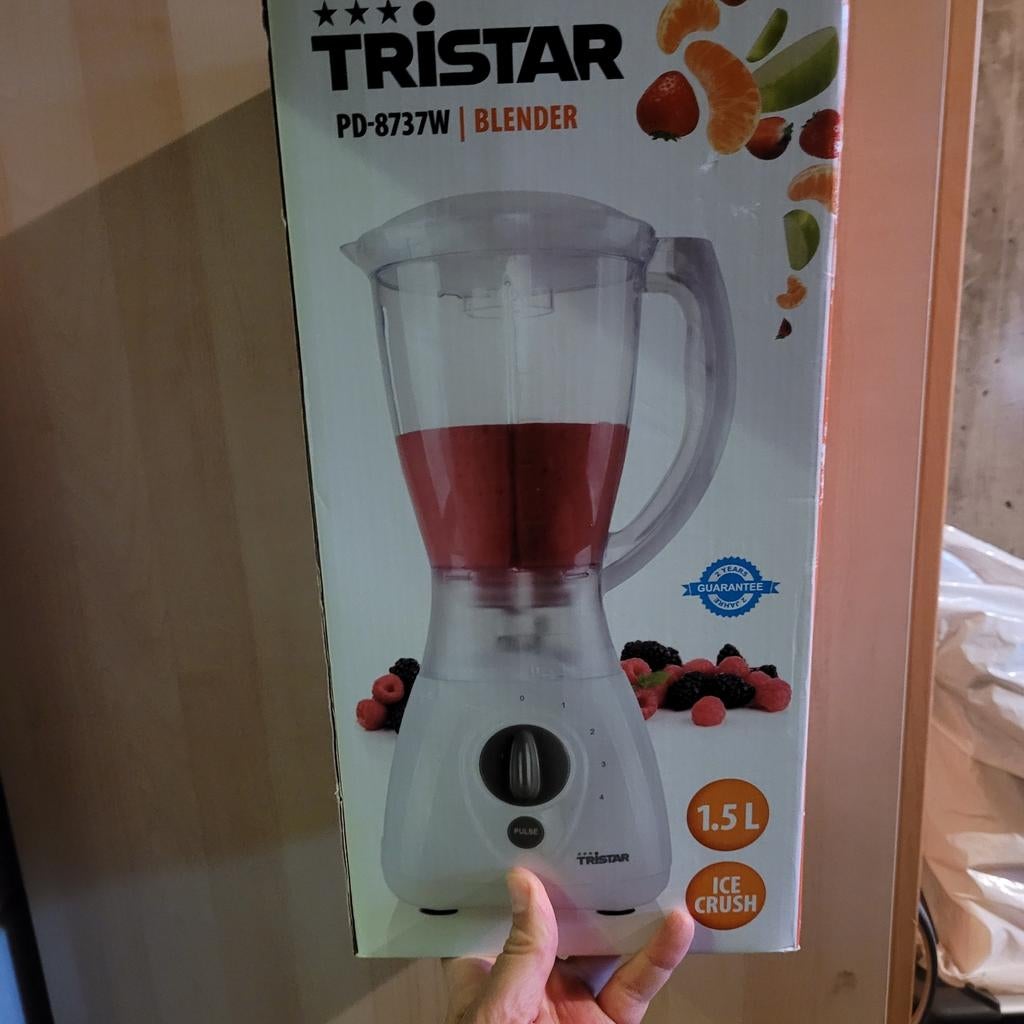 Deze nieuwe tristar blender heeft een inhoud van 1.5 Liter. Hij kan ook ijs crushen. Het is een witte blender, zoals op de doos te zien is.