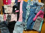 Groot kledingpakket voor kinderen, maat 128. Bevat diverse items zoals broeken, shirts, truien, jurken, jas enz