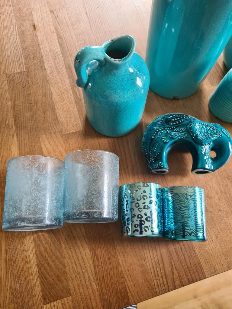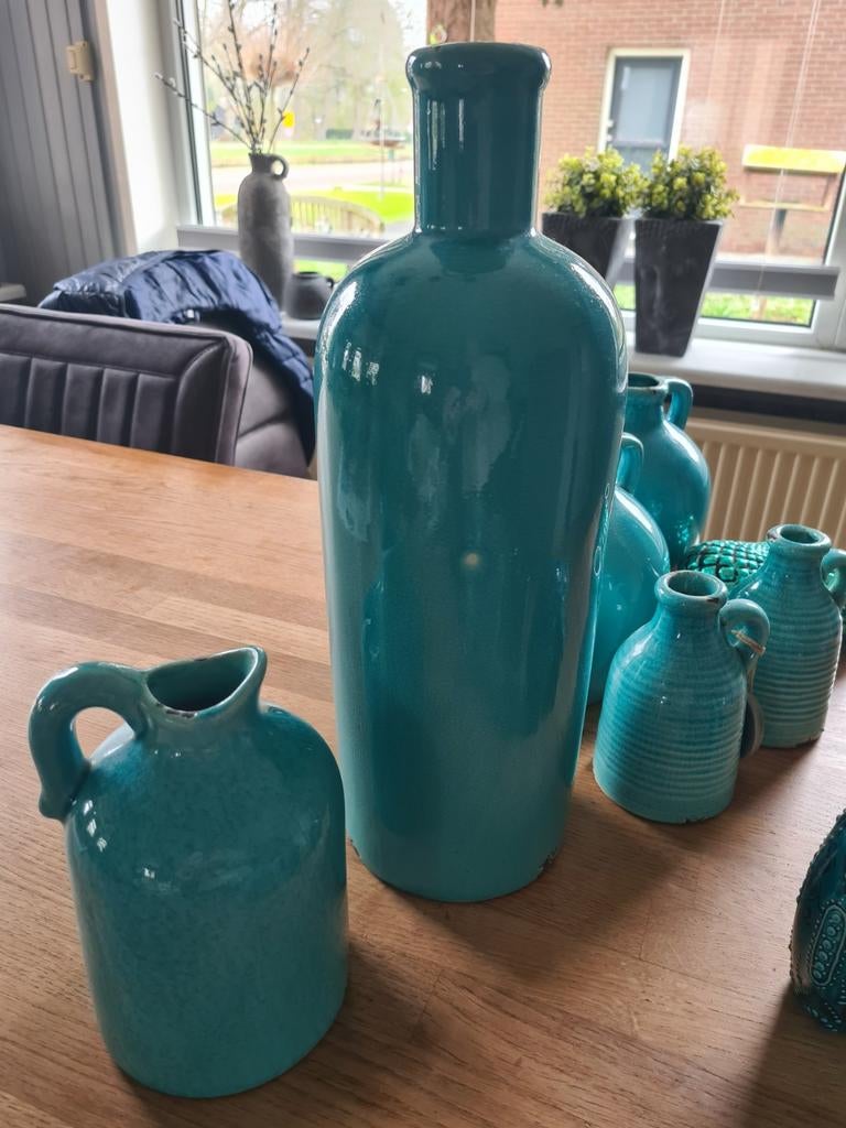 Vele soorten kruiken, vazen waxinelichthouders. Aqua blauw, doe een leuk bod. Verz kosten 6.95 Voor koper
