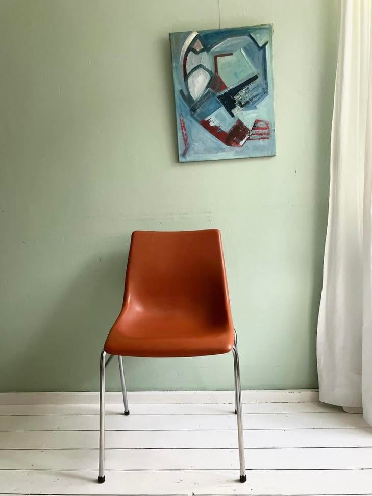 Franse vintage stoel, kunststof zitting in mooie kleur bruin en verchroomd frame. Met wat gebruikssporen. Afmeting: hoogte zitting: 45 cm. Hoogte rugleuning:76 cm. Breedte: 47 cm. Diep: 40 cm.