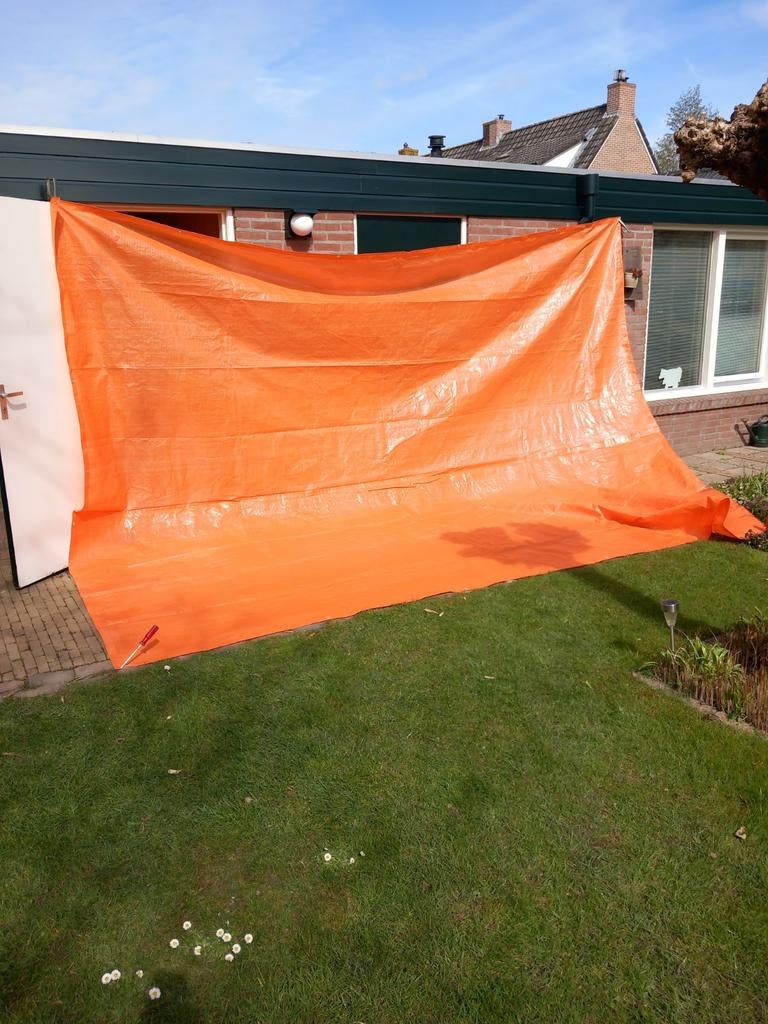 Dit is een mooi oranje zeil. Het zeil is zo goed als nieuw. Het is een groot zeil, geschikt voor verschillende doeleinden. Er zitten ringen aan de zijkanten.