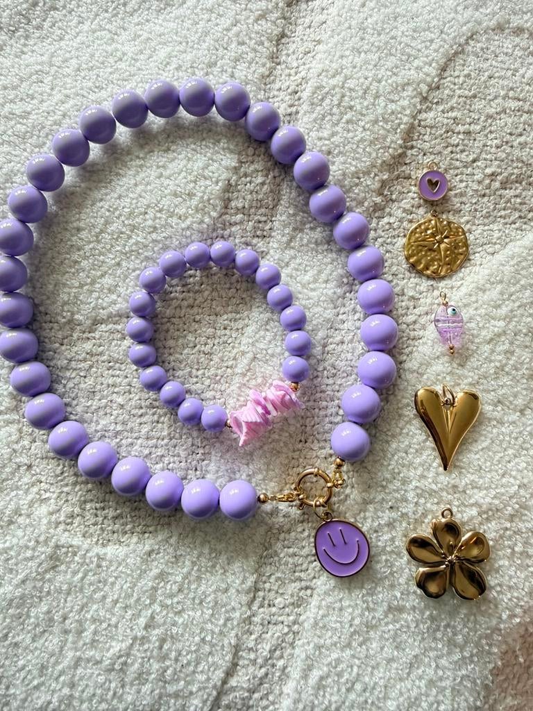 Armband & ketting met kralen lila incl bedel naar keuze
