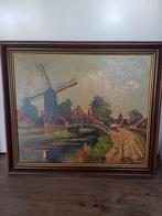 Prachtig schilderij van een hollands landschap met een molen, huizen en een waterweg. Het schilderij is ingelijst en verkeert in g