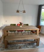 Mooie, stevige massief houten eettafel inclusief bijpassende bank en 4 stoelen van echt leer. Perfect voor een groot gezin of om u