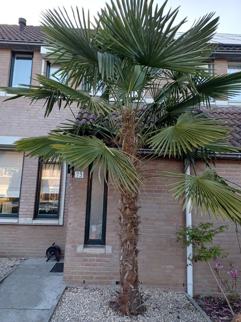 Prachtige, volwassen trachycarpus fortunei palmboom te koop. Deze winterharde palm is een aanwinst voor elke tuin en kan goed tegen het nederlandse klimaat. De boom is gezond, goed geworteld en heeft