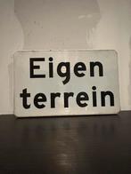 Een gebruikt bord met de tekst 'eigen terrein'. De afmetingen zijn 40x25 cm. Het bord vertoont gebruikssporen, zoals te zi