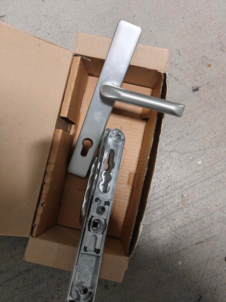 Nieuwe deurkruk met slotplaat, compleet set in originele doos. Sterk en duurzaam materiaal, geschikt voor binnen- of buitendeur. Nooit gebruikt, alleen uit de doos gehaald voor de foto. Makkelijk te m