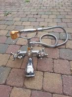 Prachtige retro badkraan met een klassiek design, voorzien van zowel een baduitloop als een handdouche. De kraan heeft een glanzende chroomafwerking met elegante gouden accenten, wat zorgt voor een luGebruikt Ophalen of Verzenden