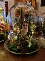 Decoratieve stolp met een bruine / sneeuw uil, mos, kleine boompjes en sfeerverlichting. Leuk als decoratie in huis of als cadeau