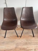 Twee comfortabele eetkamerstoelen met een bruine lederlook bekleding en zwart metalen poten. De stoelen zijn in goede staat en zijn ideaal voor aan de eettafel of als extra zitplaatsen in de woonkamer