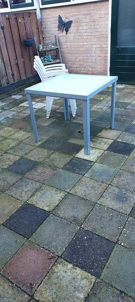 Mooie hartman tuinset, ideaal voor op het terras of in de tuin. De set bestaat uit een stevige tafel met een lichtgrijs blad en vier bijpassende witte stoelen. Perfect voor gezellige etentjes buiten.